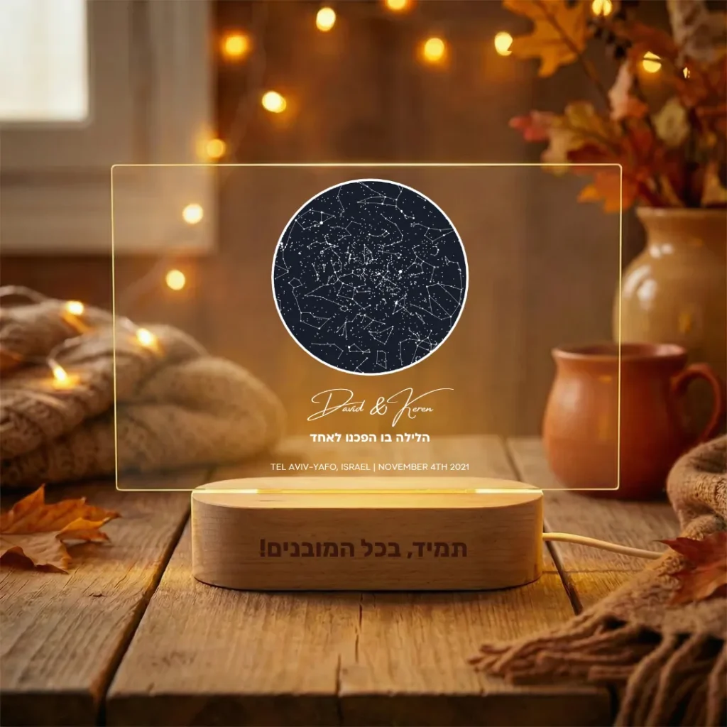 מתנה מעוצבת אישית עם תמונה – מנורה רומנטית בעיצוב מפת כוכבים לאורך