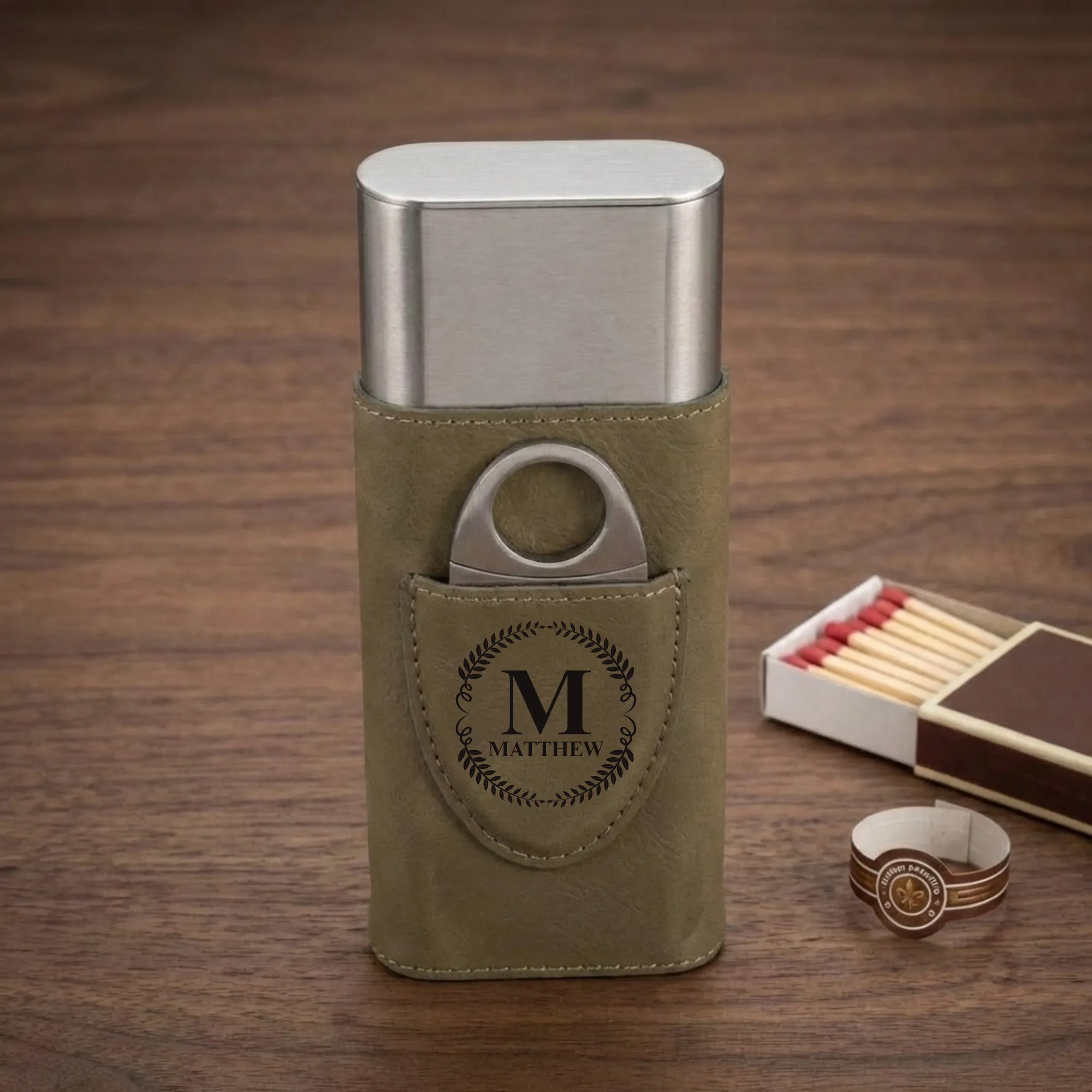מכוסה בעור טבעוני אלגנטי בגוון זית כהה, המזוודה כוללת פנים ומכסה מפלדת אל-חלד מוברשת באיכות גבוהה. העיצוב הטלסקופי מבטיח אטימה מושלמת לשמירה על טריות הסיגרים, בעוד המבנה החזק מגן על האוסף שלכם מפני מעיכה במהלך ההעברה.